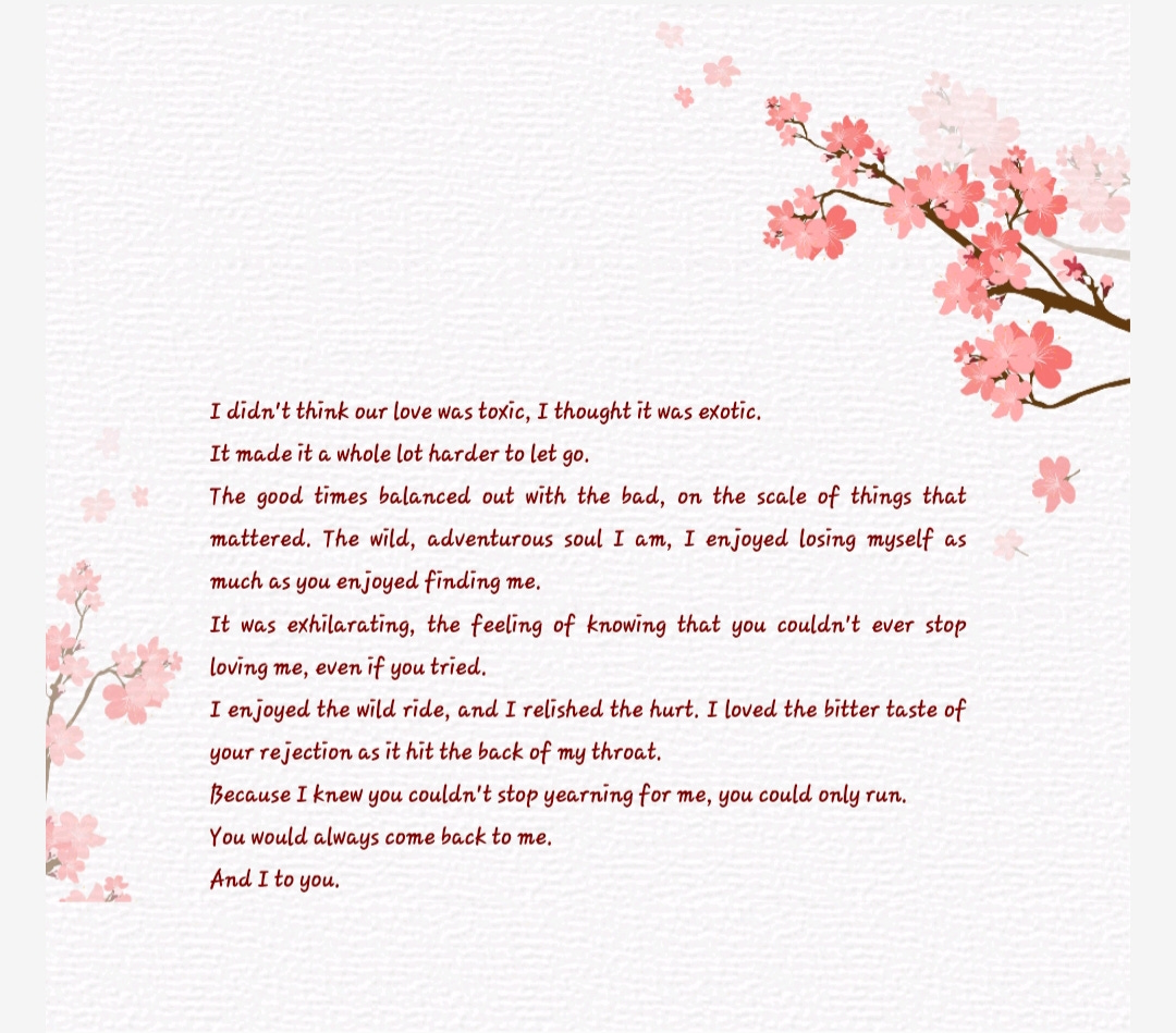 I enjoy the toxicity too. The uncertainty. “He loves me, he loves me not” playing it's sadistic melody along the strings of my heart. I push away warm, sweet affection. I laugh at sincere compliments. Then I run back to him. The one that makes me second guess my worth. The one that I am so sure loves me, the only way he can express it is of course by playing with my emotions.